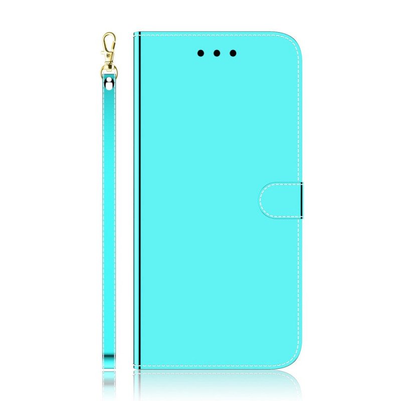 Ihr Samsung Galaxy S22 5G Ist Perfekt Geschützt In Dieser Hülle Aus Kunstleder Mit Verspiegelter Abdeckung, Die Mit Einem Sehr Praktischen Riemen Geliefert Wird.