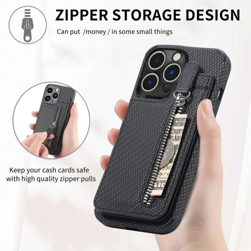 Ihr Iphone 14 Pro Max Ist Mit Dieser Karbonfaserhülle, Die Mit Einer Praktischen Brieftasche Ausgestattet Ist, Wunderbar Geschützt.