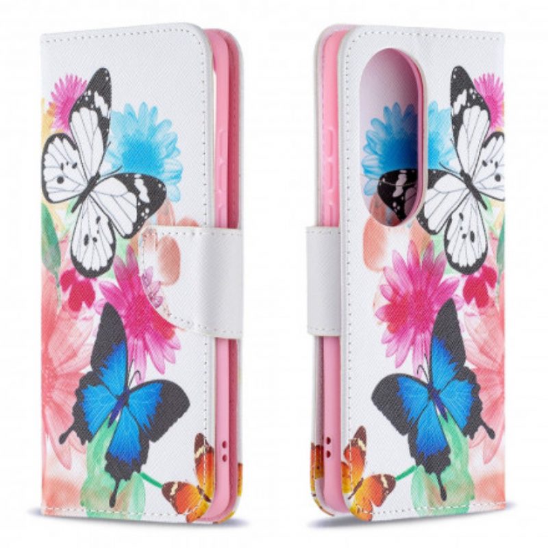 Lederhüllen Für Huawei P50 Pro Bemalte Schmetterlinge Und Blumen