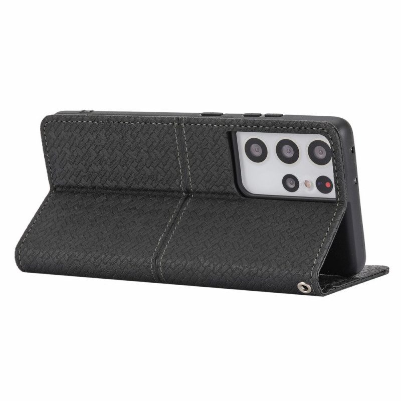 Verbessern Sie Die Sicherheit Ihres Samsung Galaxy S21 Ultra 5G Mit Dieser Hülle Im Gewebten Lederstil, Die Gleichzeitig Als Brieftasche Und Freihandständer Dient.